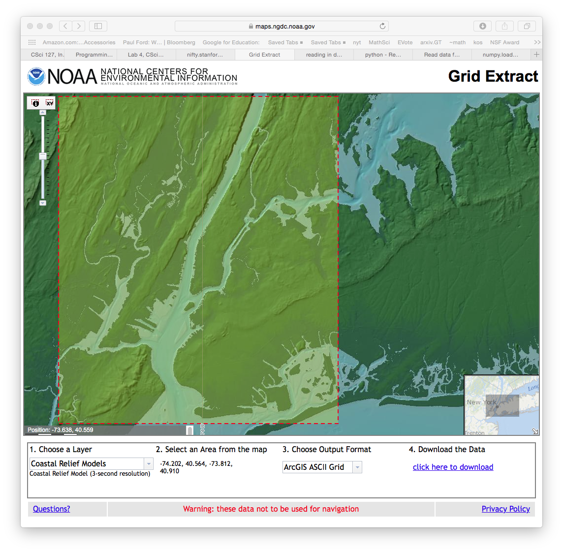For the last part of the lab, let’s combine what we have learned about images and decisions to make a flood map of the New York metropolitian area. Taken from the US National Oceanic and Atmospheric Administration (NOAA) elevation data website.