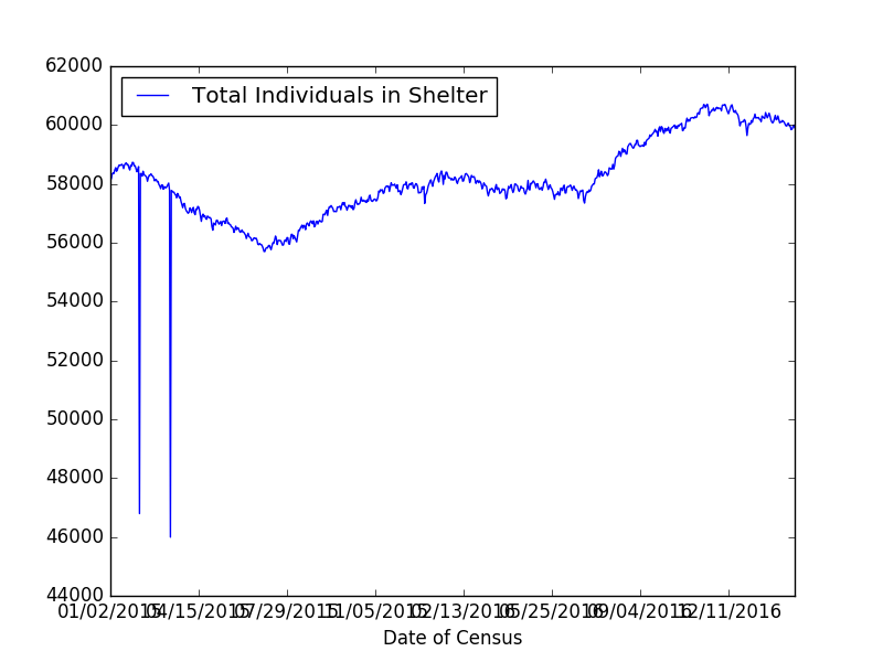 We’ll start with data that has the daily number of families and individuals residing in the Department of Homeless Services (DHS) shelter system: