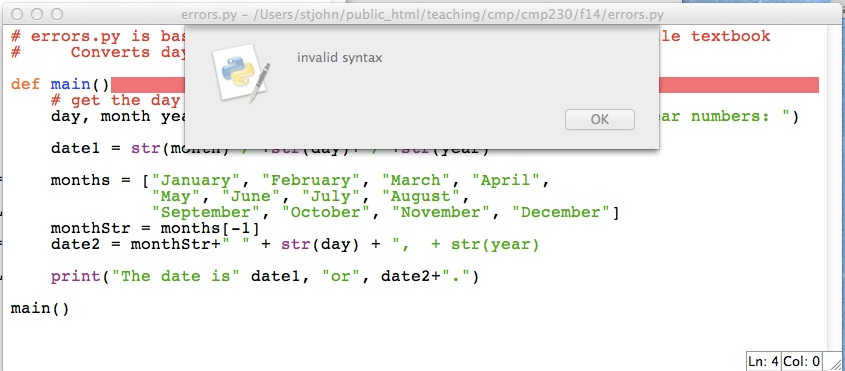 The red line indicates where the intepreter has found an error. Can you tell what it is? Syntax is another word for grammar, so, it most likely missing punctuation or a misspelling of some sort. We have spelled def correctly and have the right number of parenthesis, so, what else is missing?
