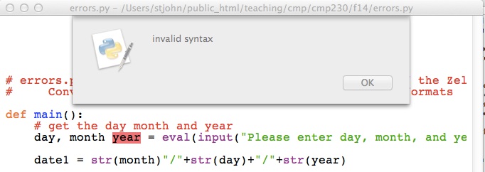 Instead of the whole line being highlighted, only the word year is. The Python intepreter was not expecting year and says there is a grammatical mistake. Since year does not include any grammatical constructs, we need to look before the message to see where the error is. Do you see it?