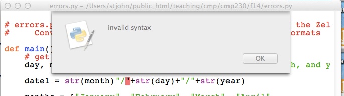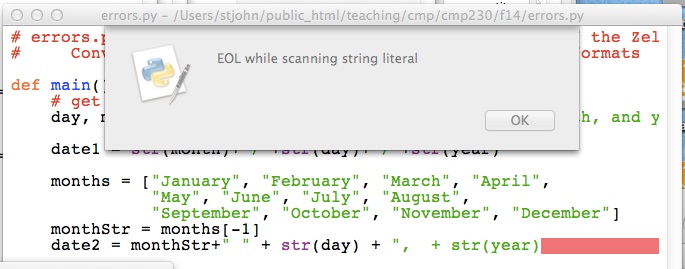 The intepreter does not understand the second “ on the line. Why? What is this line doing? It’s constructing a string and storing it in the variable date1. How do you build a string out of smaller strings?