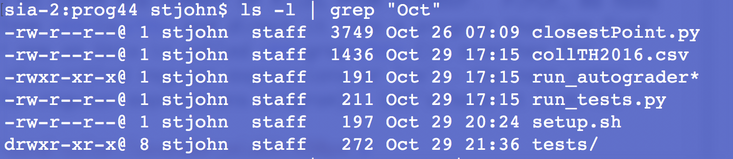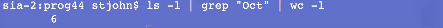 Let’s use a pipe to count the number of files from October. First, we need to take the output from ls and direct it into a program that can find patterns. A popular one on Unix is called grep (it searches for patterns, which are also called regular expressions or ‘re’– the name comes from global search for regular expressions program). Let’s have it look for ‘Oct’: