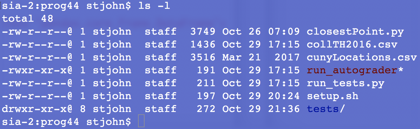 at the prompt, you will see the ‘long’ listing for every file in your current directory. (Note that it’s the letter “L”, not the number “1” that it looks like on some browsers). For example, if I ran this command in my directory for Program 20, I get: